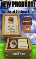 Pet Praise is proud to offer our new 5x7 metal plate Memorial Picture Urn complete with a 5x7 metal plate which presents a picture and text in remembrance of your beloved companion. Details: *Handmade in solid ash wood *Available in Mahogany, Oak, and Natural Finish *Size: 9 1/4 x 7 1/4 x 3 1/2 *Capacity: 128 lbs. Comes with a metal plate insert. To upload your pet's picture continue with order and you will be prompted to upload.